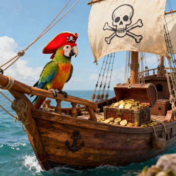 清新插画风,卡通海盗船停泊热带沙滩,椰树与木桥点缀,营造夏日海岛冒险氛围。