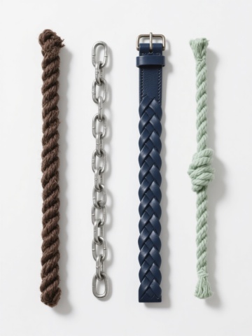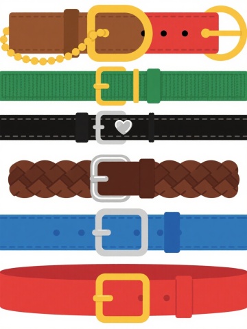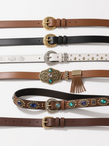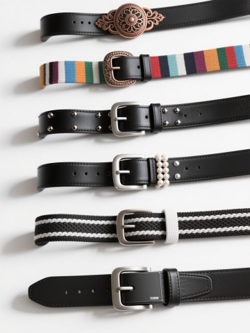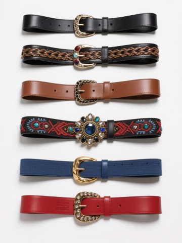 六个不同样式的腰带,白色背景,排列整齐,包括黑色细款皮带配银色方扣、棕色宽版腰带配铜色针扣、红色漆皮腰带配金色圆扣、深蓝色编织腰带配黑色日字扣、米色帆布腰带配银色插扣、灰色皮质腰带配黑色装饰扣,每个腰带保持独立清晰的展示效果,整体呈现简约商品陈列风格,突出不同材质和配色的细节对比。
