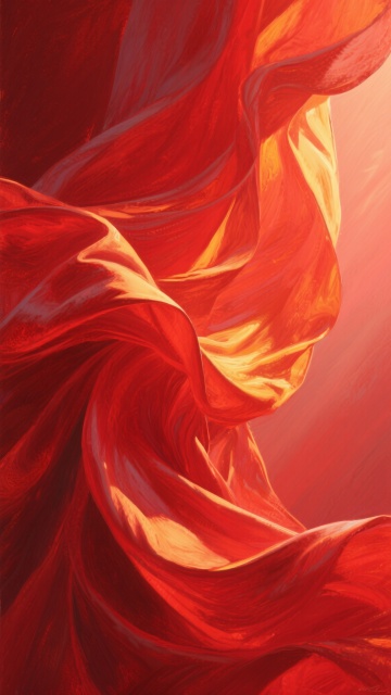 红色渐变背景,采用油画风格,画面中流动的红色绸缎呈现出丰富的纹理和层次感,光线从画面左侧斜射进来,在绸缎表面形成明暗交错的光影效果,高光部分呈现出明亮的橙黄色,阴影部分则加深为暗红色,整体色调以红色为主,营造出温暖而富有动感的氛围。