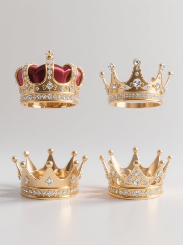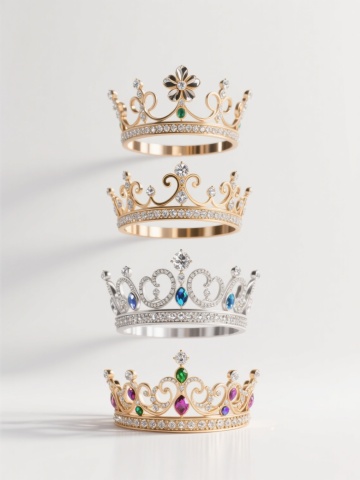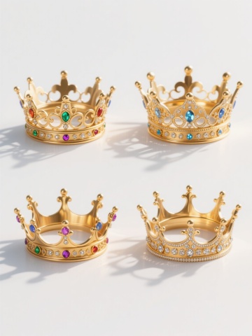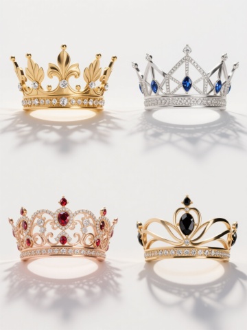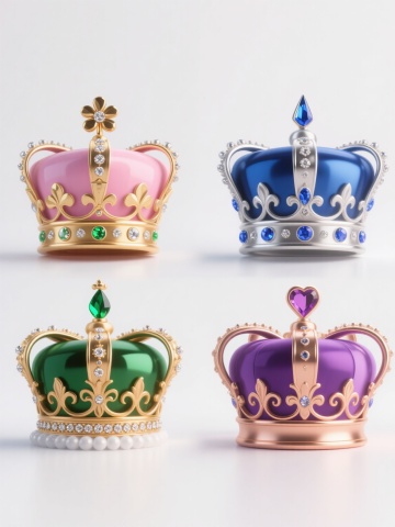 3D渲染风格,四个不同样式、不同配色的王冠,白色背景,排列整齐。每个王冠均具有精致华丽的造型,金属质感的框架上镶嵌着闪耀的钻石,细节丰富,光影效果突出,高光与阴影过渡自然,整体呈现出高贵典雅的氛围。王冠的样式各具特色,有的顶部装饰有花朵造型,有的边缘为流线型设计,有的镶嵌宝石的排列方式独特,配色涵盖金色、银色等不同金属色调,以及可能的彩色宝石点缀,彼此形成鲜明对比又和谐统一地排列在画面中。