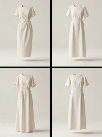 六款不同剪裁风格的连衣裙系列素材集合,规整排布在纯色背景上,保持原图的3D渲染风格、平滑的布料质感、清晰的光影过渡和简洁的构图,整体变换色彩,每款连衣裙的剪裁设计完全不同,包括但不限于A字裙、直筒裙、伞裙、修身裙、吊带裙、衬衫裙等,保持相同的布料质感和光影表现,确保整体视觉风格统一且系列感强,信息传达清晰,设计感符合服装展示的目标受众和审美需求。