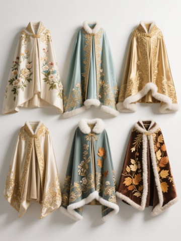 6件不同样式的华丽披风,分别对应春、夏、秋、冬、四季元素主题,每件披风具有独特配色方案,保持高质感丝绸面料,精致刺绣花纹,金色镶边装饰,带有连帽设计,披风自然垂落展现流畅褶皱,整齐排列在白色背景上,专业服装展示效果,光线柔和立体,突出披风材质与细节。