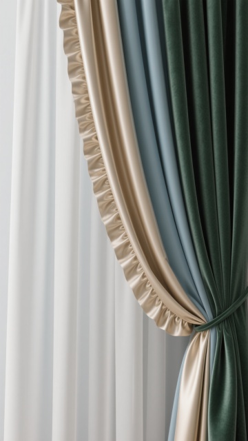 3D渲染的窗帘,具有光滑细腻的丝绸质感,自然垂坠的流畅褶皱,从左上角向右下角优雅倾斜,柔和的高光与阴影交错呈现丰富层次感,纯色背景,不同配色包括米白、浅灰、淡蓝、香槟金、墨绿,不同样式涵盖简约垂坠款、双层荷叶边款、侧边抽褶款,不同材质包含哑光棉麻、亮面缎面、半透明纱质、绒面天鹅绒