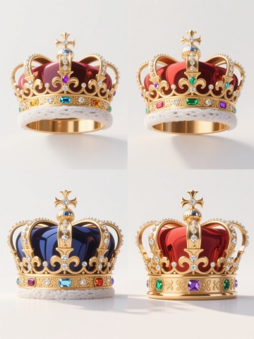 4K超高清3D渲染,4个不同样式、不同配色的王冠,保持原图金色王冠的精致3D金属质感、细腻雕刻花纹(如尖顶、宝石镶嵌凹槽、叶片装饰)和钻石镶嵌细节,王冠样式包括古典对称式、现代几何切割式、复古雕花缠绕式、简约流线型,配色分别为金色配白钻、银色配蓝宝石、玫瑰金配红宝石、黑金配黑钻,每个王冠光影立体感强烈,高光与阴影过渡自然,以整齐的两行两列网格状排列在纯白色背景上,构图平衡对称,整体设计奢华典雅,适合高端珠宝展示海报。