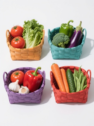 写实风格蔬果篮集合,四个不同种类的果蔬篮整齐排列在纯色背景上,每个篮子都装满了新鲜饱满的蔬菜水果,包含红辣椒、黄彩椒、西兰花、花椰菜、生菜、黄瓜、西红柿、洋葱等元素,保持高分辨率摄影质感,光影自然柔和,色彩鲜艳明快,构图均衡对称,整体视觉层次分明,蔬果纹理细节清晰,呈现出有机健康的生活气息。