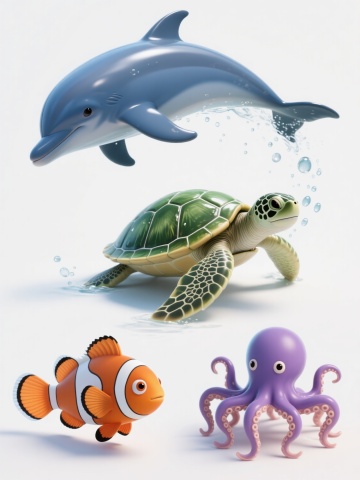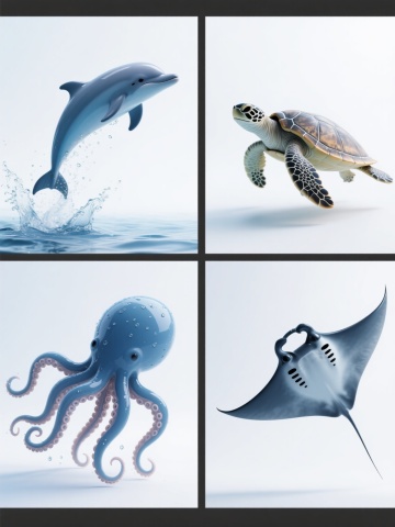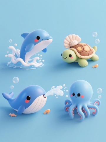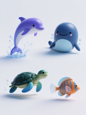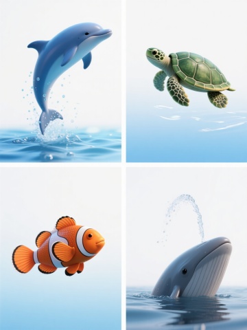 3D风格海洋动物系列素材集合,统一采用明亮浅蓝色纯色背景,保持圆润可爱的Q版造型、光滑细腻的渐变材质、柔和的光影效果和简洁明快的设计风格,四个完全不同的海洋动物元素规整排布:左侧上方是跃出蓝色浪花、周围环绕白色气泡的微笑海豚,右侧上方是顶着粉色珊瑚、睁着圆溜溜大眼睛的绿色海龟,左侧下方是抱着珍珠、吐出水流的紫色章鱼,右侧下方是摆动尾巴、口含海草的黄色小丑鱼,每个动物都带有对应的海洋元素细节和动态效果,整体画面清新治愈,充满童趣。