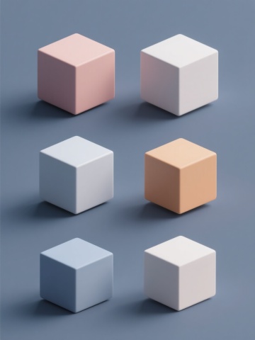 6个不同配色、完全不同造型和角度的3D立体方块元素集合,保持简约现代的设计风格,每个方块拥有平滑的表面、清晰的边缘转折和柔和的阴影效果,采用纯色背景,所有方块规整排布形成系列素材,展现出统一的设计语言和多样的视觉变化。