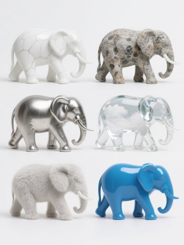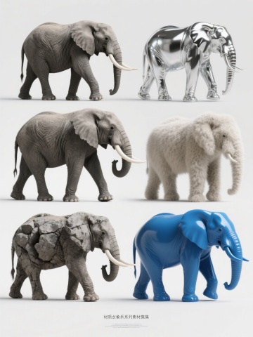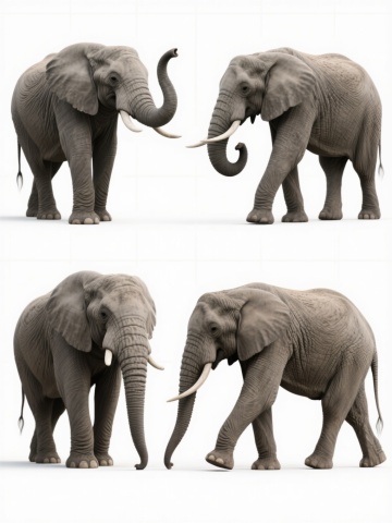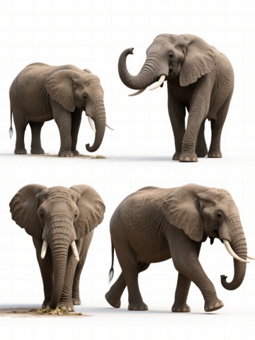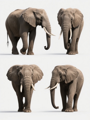 四个造型各异的卡通大象形象组成的系列素材集合,每个大象均采用相同的浅灰色调,具有磨砂质感的身体、深蓝色的脚掌、闭合的黑色椭圆形眼睛和白色的象牙,整体风格保持一致的简约可爱,第一个大象站立并扬起卷曲的鼻子,第二个大象抬起一条前腿并低头,第三个大象侧身坐着并将鼻子向前伸展,第四个大象四脚着地并将鼻子弯向一侧,四个大象规整地排布在纯色背景上,彼此间距均匀,形成协调统一的画面。