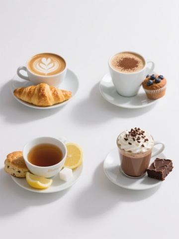 六个不同烘焙元素在纯色背景上的规整排布集合,每个元素都具有高度写实的质感,金黄酥脆的表面,清晰可见的层次感和纹理,柔和的光影效果,温暖的色调,包括牛角面包、巧克力蛋糕、蓝莓 muffin、法棍面包、蛋挞和甜甜圈,所有元素保持一致的高清晰度和逼真的食物细节,整体构图平衡对称,呈现出专业的食品摄影风格。