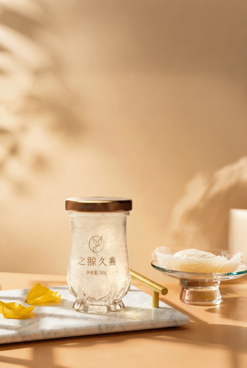 轻拟物风玻璃瓶装燕麦奶昔,液态质感细腻柔滑,实景感光影营造清新舒适氛围,质朴木质桌面点缀温馨日常。