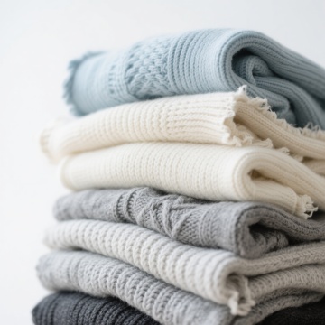 一堆柔软的针织衣物堆叠在一起,包含浅蓝色、米白色、浅灰色、深灰色等多种柔和色调的针织衫和毛衣,衣物表面有细腻的编织纹理,部分衣物边缘有毛边设计,整体呈现出温馨舒适的居家氛围,光线柔和地照亮衣物,突出其柔软的质感和自然的色彩过渡,背景为纯白色,使得衣物的色彩和纹理更加清晰突出。