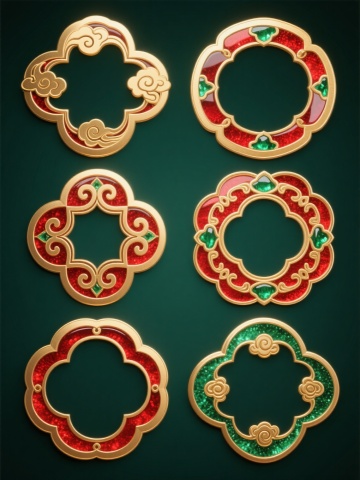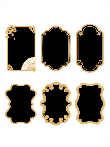 一组六个具有中国传统风格的金色边框文本框系列素材集合,每个文本框形态完全不同,包含扇形边角、云纹装饰、波浪轮廓、如意纹边框等传统元素,内部为纯色填充,整体采用金色描边,保持统一的古典雅致风格,规整垂直排布于白色纯色背景上,无任何文字内容。