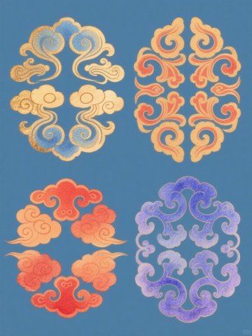 中国传统纹样风格系列素材集合,四组不同元素的对称式云纹图案规整排布,每组图案采用与原图相同的金色、蓝色、红色渐变配色方案但整体色调分别调整为暖金色调、青蓝色调、橙红色调、蓝紫色调,保持原图的水彩晕染质感与细腻笔触,背景为纯色,每个纹样元素形态各异但均遵循传统云纹的卷曲、飘逸特征,整体构图平衡对称,具有浓厚的中国传统文化韵味与装饰美感。