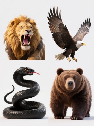 系列海洋动物插画,保持与原图一致的3D写实风格,主色调为蓝色渐变,光影明亮柔和,带有水珠飞溅的细节质感,纯白纯色背景,规整的2x2网格排布。左上角为跃出水面的蓝色海豚,身体呈优美弧线,周围有细小水珠;右上角为缓慢游动的绿色海龟,背甲纹理清晰,四肢划水姿态自然;左下角为侧身摆尾的橙色小丑鱼,鱼鳞闪烁光泽,鱼鳍舒展;右下角为喷水换气的灰色鲸鱼,头部露出水面,水柱向上喷射,整体画面和谐统一,每个动物形象独立完整,符合海洋动物类目,视觉层级分明,信息传达清晰。