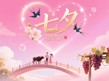横向金色文字"七夕"要柔和些加小标题”中国传统节日“ ”农历七月初七“和小印章。创意字体设计点缀两只喜鹊、花朵元素,线条流畅,高级感,粉色背景,高纯度配色。天空设计一些闪亮的心型汽泡,闪闪的星星环绕成渐变的心型图案,图案不用围绕七夕。设计一条银河架成的桥,有牛郎织女和他们的孩子和牛。再设计一颗硕果累累的葡萄果架