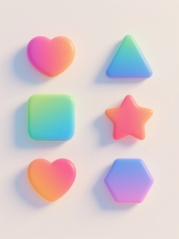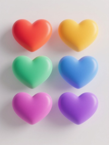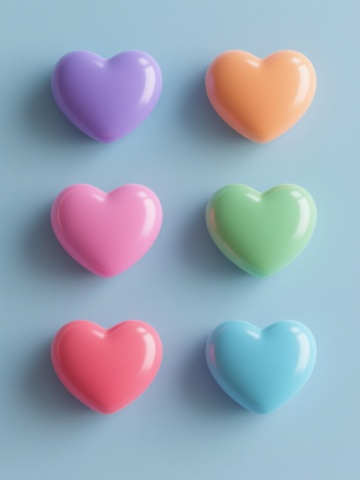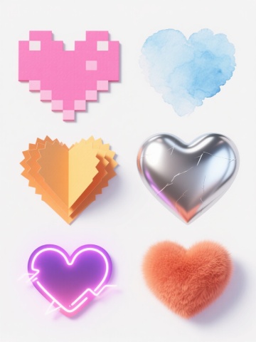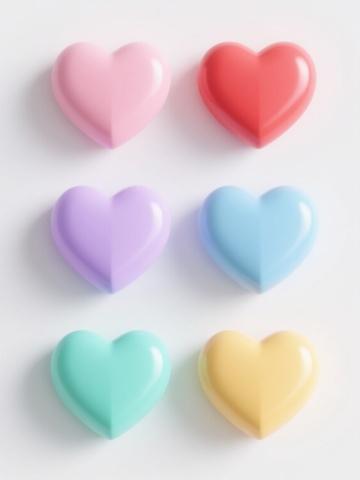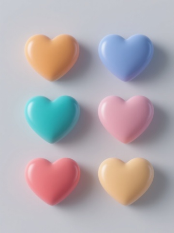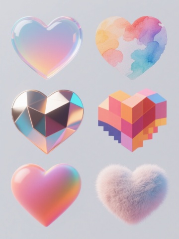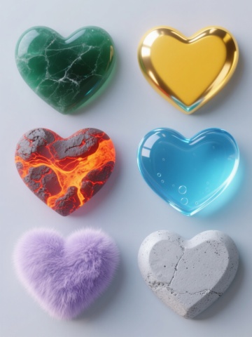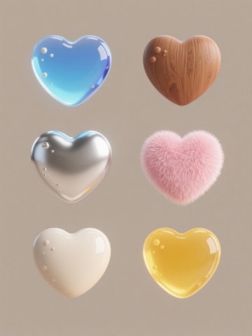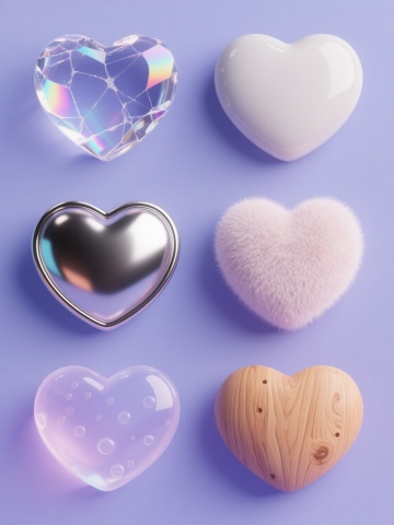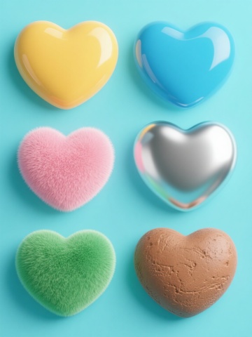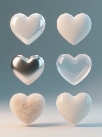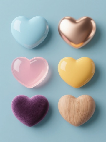 系列集合海报,纯色背景,软3D风格,六个完全不同材质的爱心元素规整排布,保持爱心的圆润造型和柔和高光特征。第一个爱心为光滑亮面陶瓷材质,呈现淡粉色;第二个爱心为磨砂玻璃材质,呈现淡蓝色,带有半透明质感;第三个爱心为哑光金属材质,呈现淡金色,带有细腻的金属颗粒感;第四个爱心为绒毛材质,呈现淡紫色,带有柔软的绒毛纹理;第五个爱心为木纹材质,呈现淡棕色,带有自然的木纹肌理;第六个爱心为大理石材质,呈现淡绿色,带有独特的大理石纹路。每个爱心都有统一的柔和光影处理,整体色彩变换丰富且和谐,视觉层级清晰,信息传达效率高,具有现代设计感。