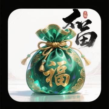 卡通感插画风,轻拟物风设计,绿色宝袋配金色花纹,节日氛围浓厚。