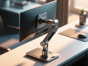 一张现代简约风格的电脑显示器产品展示图,采用全新的色彩搭配,从略微侧倾的角度拍摄,显示器主体为光滑的黑色边框与银色金属底座,屏幕呈现纯白色背景,整体设计简洁干净,具有清晰的产品轮廓和细腻的材质质感,光影柔和自然,突出显示器的现代科技感与简约美学。