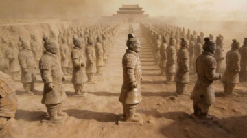 古城西安城墙上呈现气势磅礴的"西安"巨大的景观字,每个笔画由卷起翻滚的砖石组成,美丽的天空,树林远处隐约有一支考古队伍