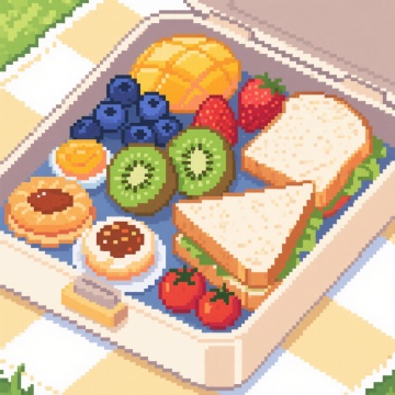 像素风手账插画,清新水果与三明治,简约格子背景,夏日野餐氛围。