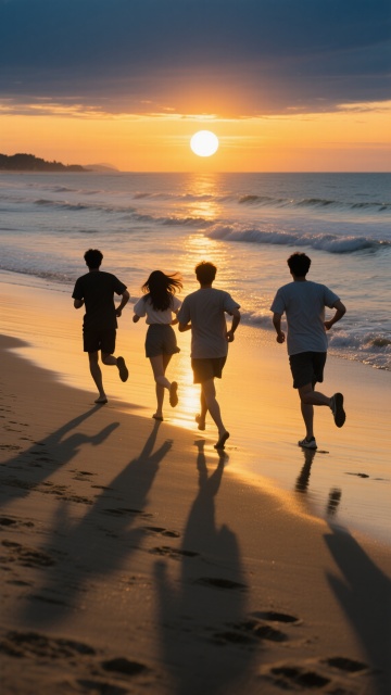 梦幻水彩风,剪影人物在夕阳下海边奔跑,柔和色调营造温馨夏日氛围。