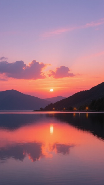 写实风格的日落湖面景观,天空被大面积绚烂的粉紫色和橙红色云霞覆盖,云层呈现蓬松的质感和丰富的层次变化,阳光从地平线洒落,将天空染成渐变的暖色调,湖面如镜般平静,清晰倒映出天空的瑰丽色彩,水中点缀着数十只姿态各异的海鸥,有的低空飞翔,有的在水面休憩,岸边可见湿润的沙滩,整体氛围宁静而壮丽,光影柔和,色彩饱和度高,细节丰富,变换细节体现在云霞的具体形态和海鸥的分布位置上,保持原有的色彩和谐与光影效果。