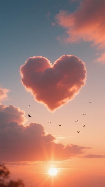 一对情侣的剪影在绚烂的日落天空下相拥,他们的脸庞靠近,即将亲吻。女孩有着飘逸的长发,男孩穿着衬衫,他们的身体微微前倾,彼此依偎。背景是由深紫、粉紫、橙红和金黄渐变组成的壮丽晚霞,云层稀疏地散布在天空中,营造出浪漫、温馨而又充满爱意的氛围。整体画面采用逆光剪影效果,人物轮廓清晰,细节柔和,光影对比强烈,色调温暖而富有层次感,构图聚焦于情侣的亲密姿态,背景的天空占据大部分画面,突出主体情感。