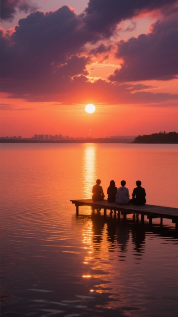 写实风格的日落景象,天空被橙红色和深紫色的云彩覆盖,太阳低垂在地平线上,散发出温暖耀眼的光芒,阳光在平静的水面上形成长长的金色倒影,一群人影坐在延伸至水中的木制栈道上,背对着镜头静静观赏日落,水面波光粼粼,远处的地平线隐约可见城市轮廓,整体氛围宁静而温暖,变换细节体现在云彩的形态和水面波纹的细微差异上。