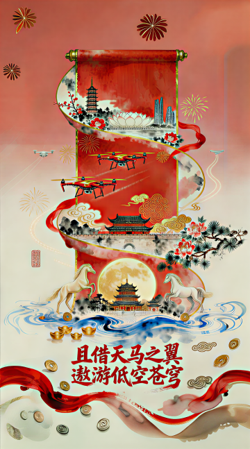 国潮风融合3D微缩艺术,以水墨笔触勾勒“马”字,嵌入中式建筑与卡通元素,喜庆热烈,拼贴感十足,传递春节旅行的欢乐氛围。