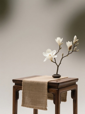 一个具有浓郁中式风格的室内场景,画面整体以米白色和原木色为主色调,营造出宁静、雅致、禅意的氛围。柔和的自然光从上方斜射下来,在背景墙上形成淡淡的光影层次,光线明亮且柔和,阴影过渡自然。画面中央偏下位置有一个圆形的原木色展台区域,展台表面光滑,边缘圆润。背景由左侧的中式木格栅、中间的圆形素色背景板和右侧的竖条木格栅组成,木格栅线条简洁规整,圆形背景板干净素雅。左侧展台旁摆放着一盆翠绿的竹子,叶片舒展,增添了生机与自然气息。整个画面构图注重留白,留空区域约占70%,形成了疏朗有致的视觉效果,展现出中式美学中“少即是多”的意境,整体风格统一、和谐,给人一种静谧、舒适、古朴而不失现代感的视觉体验。