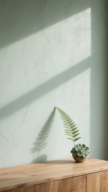 新中式风格室内场景,暖米色墙面带有细腻纹理,右侧立有金色镂空格栅隔断,左侧置有深棕色实木长案,案上摆放素雅白瓷瓶与小巧黑陶盖罐,一枝翠绿竹叶斜伸而出,柔和自然光透过格栅在墙面投下斑驳光影,整体营造宁静禅意、简约雅致的东方美学氛围,光影层次丰富,色调温暖和谐,材质质感细腻,构图遵循留白与对称美学,尽显新中式设计的韵味与格调。