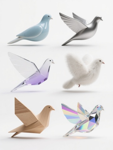 白色背景上,六只不同样式、不同风格、不同材质的海鸥排列整齐,每只海鸥都呈现出独特的艺术处理:一只为超写实风格,羽毛纹理清晰可见,翅膀边缘有自然的灰色渐变,喙部呈明亮的橙黄色,爪子为淡黄色,具有真实鸟类的质感和细节;一只为扁平化设计风格,采用简洁的线条勾勒轮廓,色彩纯净,白色身体配以黑色翅膀尖,造型简约现代;一只为3D立体风格,具有明显的光影效果和体积感,仿佛金属材质打造,表面有细腻的反光,翅膀呈现出金属的冷硬质感;一只为水彩画风格,色彩柔和晕染,边缘有自然的模糊效果,白色羽毛中透出淡淡的粉色和蓝色,具有透明感和艺术韵味;一只为剪纸艺术风格,采用多层叠加的方式,色彩明快,边缘锐利,具有传统剪纸的镂空效果和图案美感;一只为卡通风格,造型可爱夸张,眼睛圆润,身体胖乎乎,羽毛用简单的色块表现,色彩鲜艳活泼。所有海鸥均保持飞行姿态,翅膀舒展,排列成整齐的队列,整体画面简洁有序,符合海报设计的视觉层级和信息传达效率,具有良好的设计感。