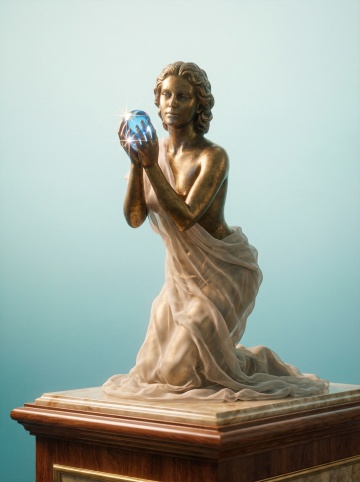 梦幻鎏金宫廷,女神持光杖立于云巅,翼马环绕,光影交织,3D重拟物风呈现欧洲宫廷艺术的神圣与奢华。