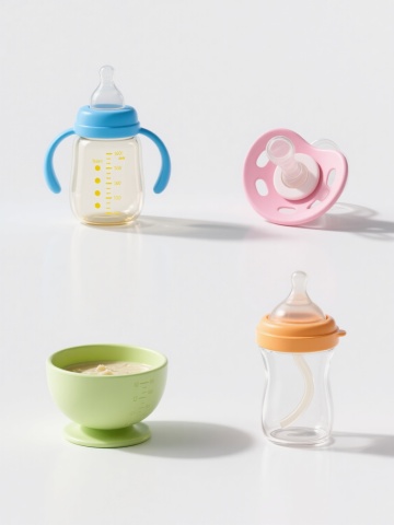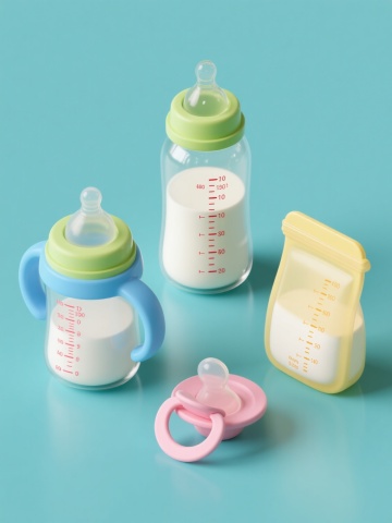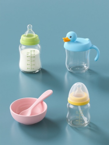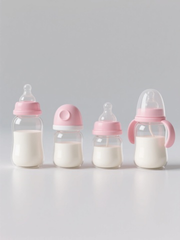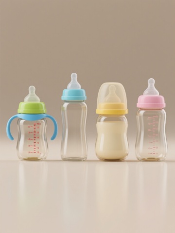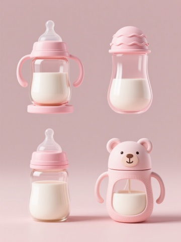 4个造型各异的婴儿奶瓶系列素材集合,保持3D渲染的圆润可爱风格,主色调为黄色、橙色和白色,采用柔和的高光和阴影表现光滑的塑料质感,每个奶瓶都有独特设计:第一个是带黄色鸭嘴和星星图案的双柄奶瓶,第二个是带粉色吸管和波浪纹的宽口奶瓶,第三个是带蓝色刻度和动物耳朵造型的防胀气奶瓶,第四个是带绿色硅胶套和卡通图案的便携奶瓶,所有奶瓶规整排列在纯色背景上,整体构图平衡对称,充满童趣和亲和力。