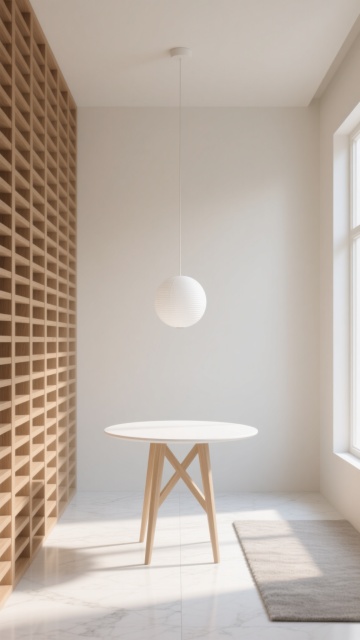 新中式风格背景,浅米色带有细微纹理的墙面,右侧是竖条纹木质格栅装饰,左上方有疏朗的黑色枯枝枝干,地面为浅色木地板,中央放置一个浅木色圆形矮桌,整体采用柔和的暖色调,光线从右前方柔和洒入,形成自然的光影过渡,营造出宁静、简约、禅意的东方美学氛围,空间布局疏朗有致,材质纹理清晰自然,具有现代简约与传统中式元素融合的设计感。