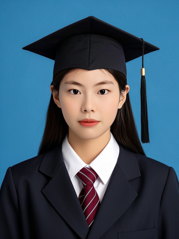 女生证件照,黑色学士袍,内衬是天青色汉服,鬓角和帽子上簪青色洋桔梗和青色玫瑰、白色小花,学士帽穗子,手执卷轴,领口复古花纹,黑灰色朦胧背景。