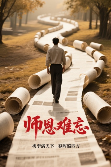 试卷卷曲成蜿蜒纸路,教师独行纸路中心(背影 ),复古棕黄 + 米白报纸色调;最下方红色雄浑书法大字“师恩难忘”,黑色小字“桃李满天下・春晖遍四方”