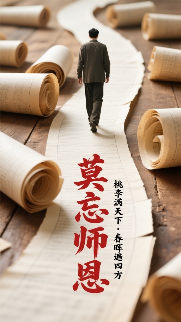 这张海报以海量书卷铺成知识之路,教师身影在其间坚定迈进,寓意其在知识海洋中为学生探路领航。“师恩难忘”点明主题,“桃李满天下·春晖遍四方”则生动诠释教师的育人成果与温暖影响。书卷元素承载文化传承,教师形象凸显育人担当,整体用具象画面与经典语句,将师恩的深厚、教育的意义浓缩其中,为教师节创意提供了“以知识之途衬师者耕耘,以桃李春晖抒感恩深情”的灵感,简洁有力地歌颂了师恩绵长。