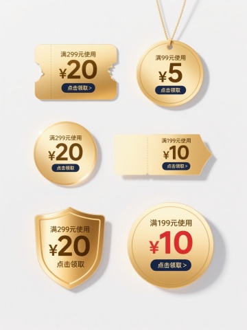 金色系现代简约风格优惠券系列素材集合,保持金色与白色为主色调,金色采用渐变金属质感,白色背景纯净简洁,光影柔和自然,高光细节精致,整体设计高端大气。包含6个完全不同造型的优惠券:1. 方形带撕边设计优惠券,标注“满299元使用 ¥20 点击领取”;2. 圆形吊牌式优惠券,标注“满99元使用 ¥5 点击领取”;3. 长条形带斜角标签优惠券,标注“满299元使用 ¥20 点击领取”;4. 圆角矩形带折叠角优惠券,标注“满199元使用 ¥10 点击领取”;5. 盾形优惠券,标注“满299元使用 ¥20 点击领取”;6. 椭圆形优惠券,标注“满199元使用 ¥10 点击领取”。所有优惠券均包含“点击领取”按钮,按钮采用深蓝色或红色,文字为金色或黑色,字体选用无衬线体,字号大小对比鲜明,信息层级清晰,整体规整排布在白色纯色背景上,每个优惠券造型独特,折扣元素内容完整,保持统一风格。