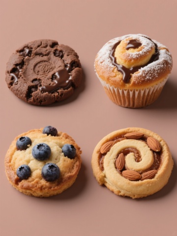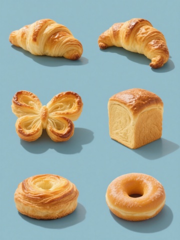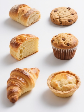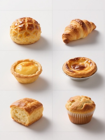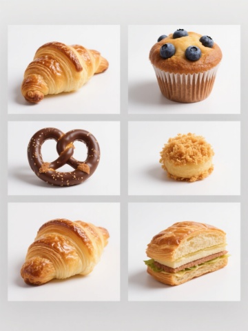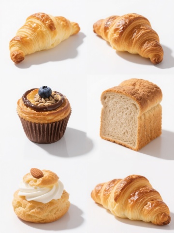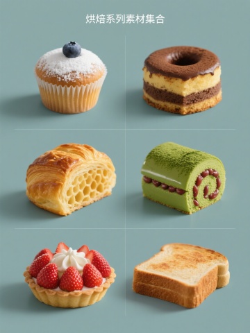 六个不同烘焙元素组成的系列素材集合,规整排布在纯色背景上,保持超写实风格,每个元素都具有高度的细节和质感,包括:1. 表面撒满可可粉的巧克力熔岩蛋糕,顶部有一个完美的圆形凹陷;2. 层次分明的牛角面包,表面呈金黄色,带有焦糖色的烤痕;3. 点缀着新鲜草莓和薄荷叶的奶油挞,挞皮酥脆,奶油细腻;4. 表面光滑的抹茶红豆卷,切面可见绿色的蛋糕体和红色的红豆馅;5. 撒满杏仁片的黄油曲奇,边缘呈金黄色,中间略微凸起;6. 顶部有漩涡状奶油和彩色糖针的杯子蛋糕,蛋糕体松软,奶油轻盈。每个烘焙元素都具有逼真的光影效果,高光处闪耀着光泽,阴影部分层次分明,整体画面干净整洁,突出烘焙食品的美味和质感。