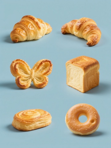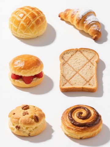 纯白纯色背景,保持超写实食物摄影风格,高分辨率,极致清晰的细节表现,柔和自然的顶侧光照射,呈现出面包表面金黄至深棕的渐变色泽与丰富的层次感,突出食物的质感与新鲜感。画面中规整排布6个完全不同的烘焙面包元素:第一个是表面撒有白色糖粉的圆形丹麦肉桂卷,螺旋状层次分明;第二个是顶部带有十字切口、内部夹有巧克力碎的方形巧克力餐包,表面呈均匀的浅棕色;第三个是长条形的芝麻法棍,表面布满细密的芝麻颗粒,有自然的烘焙裂纹;第四个是双层夹心的草莓酱甜甜圈,表面淋有半透明的粉色糖霜,点缀着细小的草莓碎;第五个是呈三角形的全麦核桃司康,表面有明显的核桃颗粒,色泽偏深;第六个是顶部放有一颗完整蓝莓的圆形蓝莓麦芬蛋糕,表面有烘焙形成的自然鼓包和裂纹。所有面包元素大小相近,以两行三列的整齐网格状布局排列,每个面包之间保持均匀间距,整体画面简洁干净,突出各类面包的独特形态、纹理和色泽,具有强烈的视觉吸引力和食欲感,适合作为烘焙产品系列素材集合。