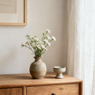 原木色桌面搭配浅色墙面的室内场景,柔和的自然光从左侧洒入形成斑驳光影,右侧白色开放式书架上摆放不同造型的陶瓷花瓶与装饰摆件,桌面上换为盛放绿色植物的白色花盆和叠放的浅色布艺餐垫,整体采用米色、浅灰与原木色调营造温馨简约的居家氛围,焦点清晰、背景虚化,呈现干净通透的生活美学感。