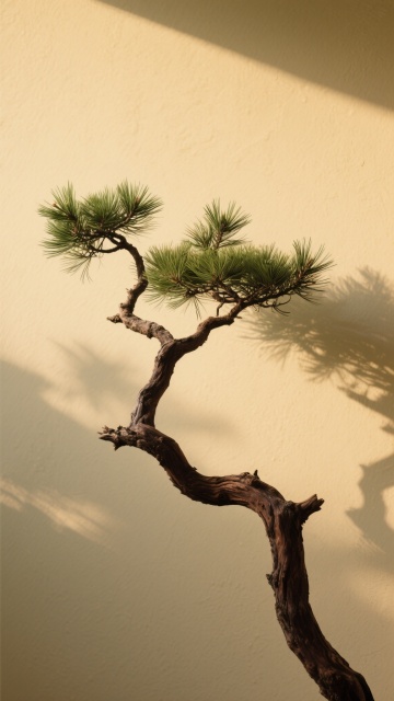 新中式背景,原木色条案上摆放着白色陶瓷花瓶和深色小罐,花瓶中伸出一枝带有嫩绿叶片的树枝,右侧是竖条形的木质格栅屏风,浅米色墙面带有细微纹理,柔和的自然光透过格栅在墙面上投下斑驳的光影,整体营造出宁静、素雅、禅意的东方美学氛围,画面构图简洁对称,色调温暖和谐,材质呈现原木的自然纹理与陶瓷的细腻质感,光影层次丰富柔和。