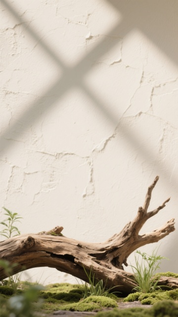 一个具有浓郁中式风格的室内场景,画面整体以米白色和原木色为主色调,营造出宁静、雅致、禅意的氛围。柔和的自然光从上方斜射下来,在背景墙上形成淡淡的光影层次,光线明亮且柔和,阴影过渡自然。画面中央偏下位置有一个圆形的原木色展台区域,展台表面光滑,边缘圆润。背景由左侧的中式木格栅、中间的圆形素色背景板和右侧的竖条木格栅组成,木格栅线条简洁规整,圆形背景板干净素雅。左侧展台旁摆放着一盆翠绿的竹子,叶片舒展,增添了生机与自然气息。整个画面构图注重留白,留空区域约占70%,形成了疏朗有致的视觉效果,展现出中式美学中“少即是多”的意境,整体风格统一、和谐,给人一种静谧、舒适、古朴而不失现代感的视觉体验。