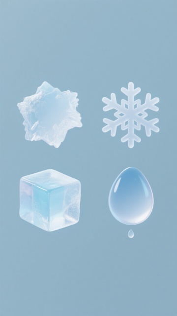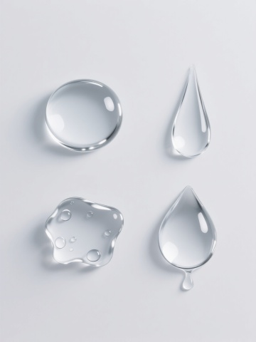 纯色背景上,一套四个完全不同造型的雨滴元素集合,保持圆润可爱的卡通手绘风格,水滴采用渐变的浅蓝色调,带有高光和阴影细节增强立体感,每个雨滴造型独特(如:一滴泪珠状雨滴、一滴带有小气泡的雨滴、一滴微微扭曲的雨滴、一滴顶部带小尖的雨滴),所有雨滴元素规整地呈矩阵式排布,整体画面简洁明快,充满童趣,视觉风格统一。