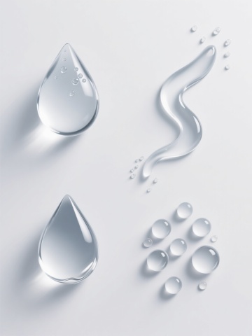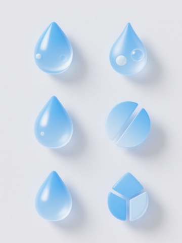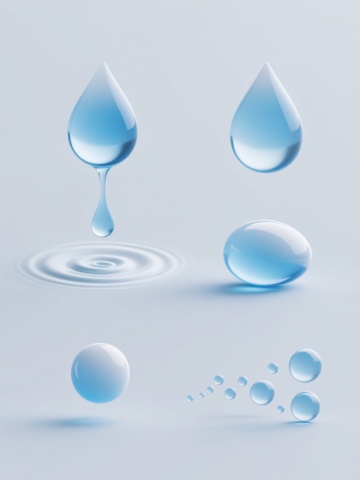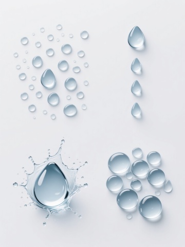 六个水滴元素组成的系列素材集合,每个水滴均保持原有的写实风格和蓝白渐变配色,展现完全不同的造型和角度:第一个是水滴即将滴落的瞬间,第二个是水滴刚刚接触水面形成涟漪的状态,第三个是水滴在空中自由下落的动态,第四个是水滴在平面上滚动的形态,第五个是水滴悬浮在空中的静态,第六个是多个小水滴汇聚成一个大水滴的过程,所有元素规整排布在纯色背景上,保持统一的视觉风格和设计感。
