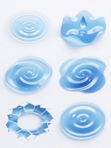 白色背景上,六个具有相同3D渲染质感的水纹元素组成的系列素材集合,每个水纹形态完全不同:第一个是向外扩散的同心圆涟漪,第二个是不规则波浪状起伏,第三个是中心向上凸起的水滴状波纹,第四个是相互交错的螺旋状纹路,第五个是边缘破碎的不规则环形波纹,第六个是中心凹陷的漩涡状水纹。每个水纹都有透明的液体质感,表面有细腻的高光反射和阴影细节,整体色彩变换为从浅蓝到深蓝的渐变色调,所有元素规整排布,保持统一的视觉风格和设计感。