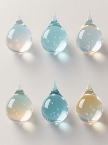 6个具有高写实3D质感的水珠素材,每个水珠拥有独特的透明渐变配色和表面反光样式,水珠内部包含细微气泡和自然的光影折射效果,整体悬浮于纯净的浅色背景之上,以上下两行各三个的整齐排列方式呈现,每个水珠保持圆润饱满的形态并带有尖锐的滴落尖端,光线从顶部柔和照射,形成明亮的高光区域和自然过渡的阴影,整体画面干净简洁,突出水珠的通透质感与立体感。