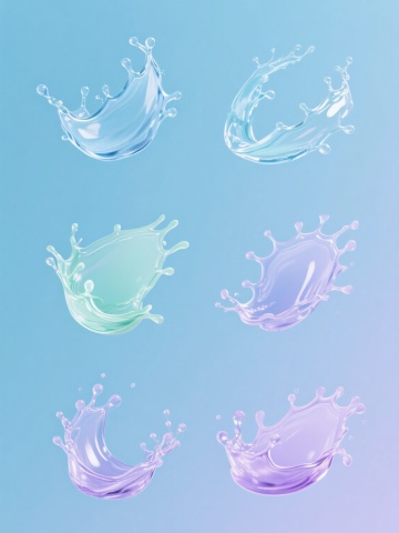 六个具有高度设计感的水花素材集合,每个水花均为不同造型和角度的透明液态水元素,保持水花的晶莹质感与动态飞溅效果,整体采用统一的纯色背景,画面整体色彩变换为[此处可指定具体颜色,如:纯净的天蓝色/清新的薄荷绿/优雅的淡紫色],所有水花元素规整排布,形成系列感强的设计素材,无任何文字、LOGO、二维码及多余装饰,强调水花的形态美感与色彩统一性。