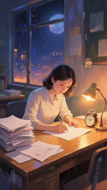 全景俯拍视角,在一座被晨光温柔唤醒的百年老校舍三楼走廊尽头,一间微微敞开着木门的教室正悄然诉说着时光故事——褪色的墨绿色黑板上用白色粉笔写着数学公式和几句潦草的励志格言,黑板边缘还挂着泛黄的世界地图,阳光透过爬满常春藤的玻璃窗,在地面切割出菱形光斑,光斑中漂浮着细小的尘埃。二十张核桃木课桌呈整齐的四列排列,每张桌面上都有深浅不一的刻痕,其中一张靠窗的课桌上,压着半块橡皮、翻开的语文课本(第三十七页的《从百草园到三味书屋》被阳光照亮),以及用玻璃瓶装着的野雏菊。教室后方的黑板报上用彩色粉笔绘制着"新学期新希望"的主题画,角落的饮水机旁堆着几个空水桶,墙角的老式吊扇正缓慢转动,在天花板上投下旋转的阴影,空气中弥漫着粉笔灰、旧书本和淡淡消毒水混合的味道,色调以温暖的赭石色木质纹理为基底,点缀着苔藓绿黑板与天蓝色窗帘的清新对比。